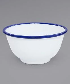 Crow Canyon Home V02BLU Vintage 16 Oz. White Round Enamelware Footed Bowl With Blue Rolled Rim
