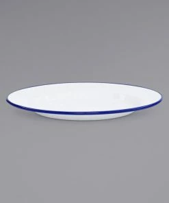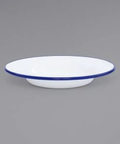 Crow Canyon Home V20BLU Vintage 10 1/4″ White Wide Rim Enamelware Footed Plate With Blue Rolled Rim