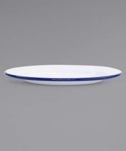 Crow Canyon Home V19BLU Vintage 8″ White Wide Rim Enamelware Footed Plate With Blue Rolled Rim